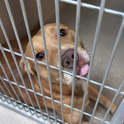 “Sunny” is a 2-year-old male pit bull terrier with a gold coat.
