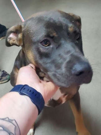 “Zeta” is a 1-year-old female pit bull terrier with a black and tan coat.