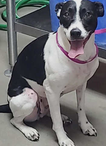 “Roasie” is a 2-year-old female pit bull terrier with a short black and white coat.