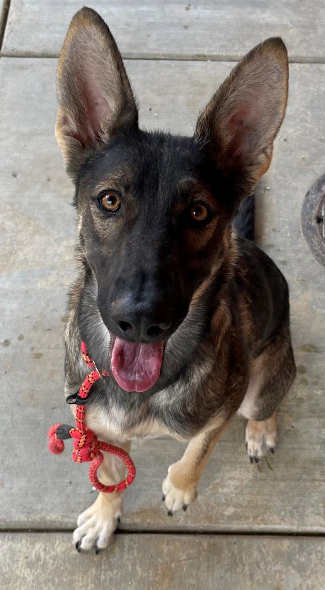 “Dory” is a 1-year-old female German shepherd-Belgian malinois with a black and tan coat.