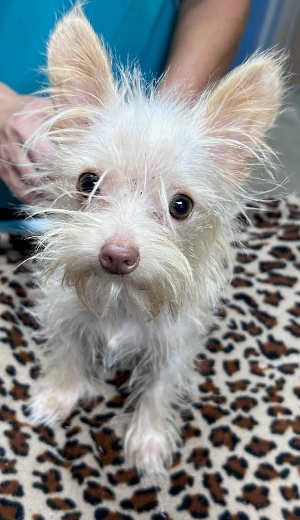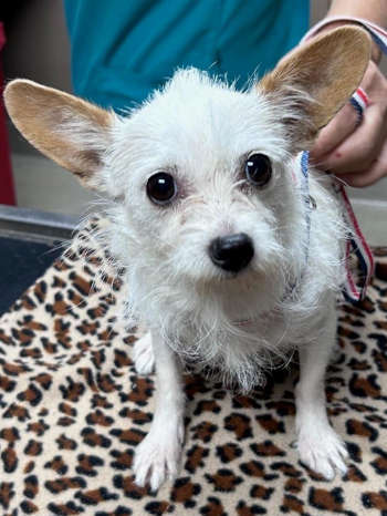This 4-year-old female wirehaired terrier has a white coat.