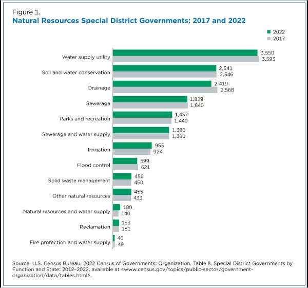 Everyone can appreciate that irrigation and proper water management are critical functions for stable agriculture. The Census of Governments captures several types of these special districts that you may not be aware of, some unique to a geographic region.