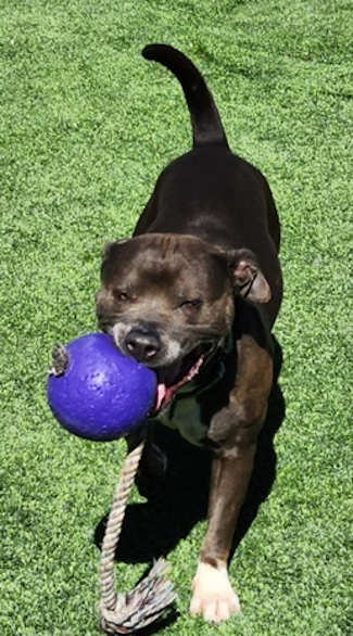 Also available is “Paige,” a female pit bull terrier mix with a short gray and white coat. She has been spayed.