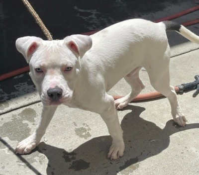 “Spot” is a 7-month-old male pit bull puppy with a white coat.