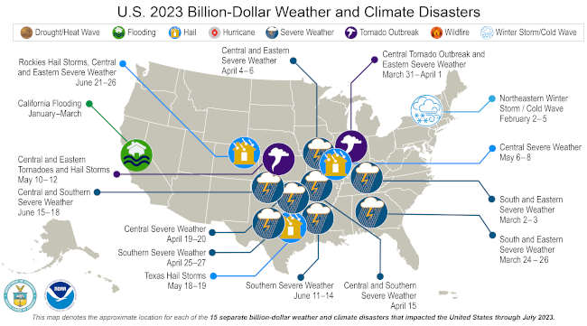 There have been 15 individual weather and climate disaster events confirmed for January through July 2023, each with losses exceeding $1 billion. This is the highest number of billion-dollar disasters ever recorded for the first seven months of a year since NOAA began tracking these events in 1980.