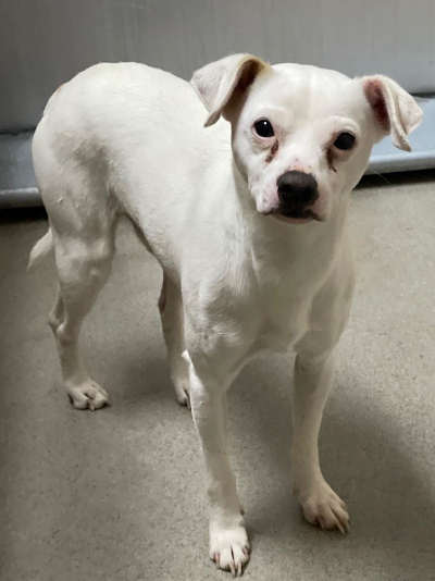 This 2-year-old male Chihuahua-terrier mix has a short white coat.
