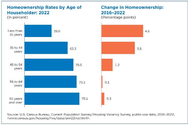 The pattern was similar from 2019 to 2022 when homeownership rates also rose about 2% among householders under age 35 and between ages 35 and 44, with one exception: the rate also inched up (0.5 percentage points) among those age 65 and over. There was no statistically significant change among householders in other age groups.