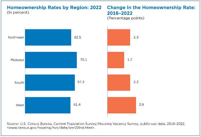 By 2022, the homeownership rate in the Midwest hit 70%, the highest of all regions. The South had the second-highest homeownership rate (67.3%), followed by two regions that were not statistically different: the Northeast (62.5%) and West (61.4%).
