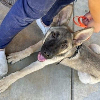 “Little Foot” is a 7-month-old male German shepherd puppy with a short black and tan coat.