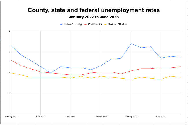 The California Employment Development Department’s new jobless report for June showed that Lake County’s unemployment rate for last month was 5.5%, down from 5.6% in May and 4.6% in June 2022.
