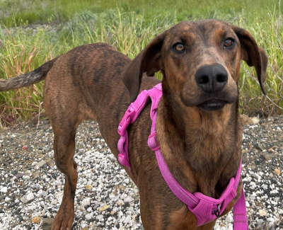 “Trixie” is a 3-year-old female hound with a short brown coat.