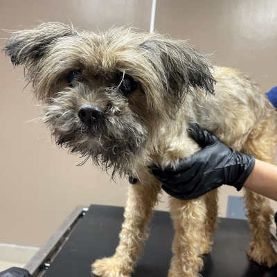 This 12-year-old female terrier has a brown and black coat.