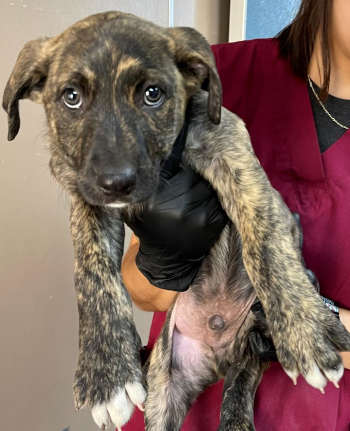 This 2-month-old male Catahoula leopard dog puppy has a short brindle coat with white markings.