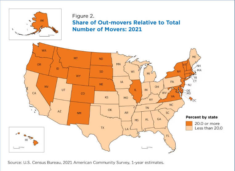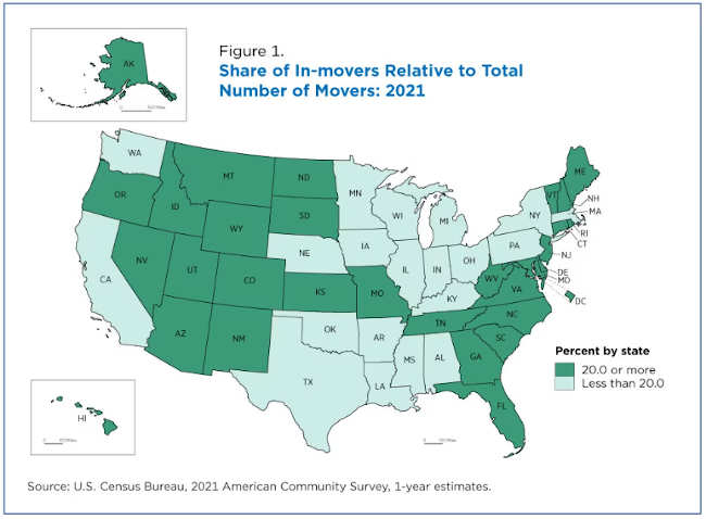 The Census Bureau regularly publishes data on state-to-state migration flows and just released estimates for 2021 based on 1-year data from the American Community Survey (ACS), which asks respondents if they changed residence in the last year.