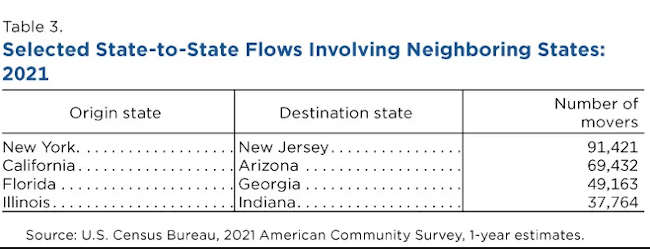 In the Northeast, for example, the largest state-to-state flow was from New York to neighboring New Jersey. In the Midwest, it was from Illinois to neighboring Indiana.