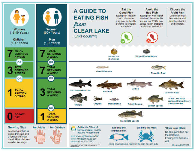 In fact, the Office of Environmental Health Hazard Assessment, or OEHHA, has a blanket fish advisory recommendation for all California lakes and reservoirs for a majority of the most commonly fished species. There is also a fish consumption advisory specific to Clear Lake, which can be seen at most of the public ramps, parks, and fishing access points, in both English and Spanish.