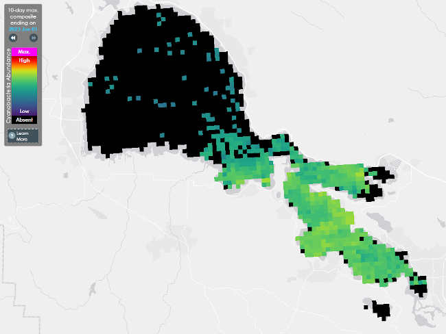 This site also provides a satellite freshwater HABmap tool developed by San Francisco Estuary Institute, or SFEI. This map displays estimated amounts of cyanobacteria in large water bodies calculated from satellite imagery. The map includes approximately 250 water bodies in California large enough to be detected by the satellite. It is designed as a screening level analysis tool to indicate past 10-day aggregate conditions.