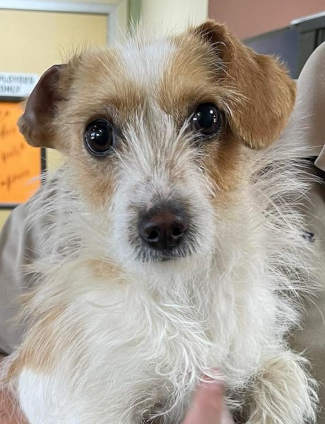 This 9-month-old female Jack Russell terrier has a short brown and white coat.