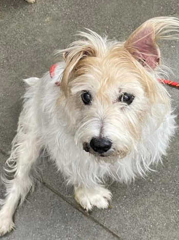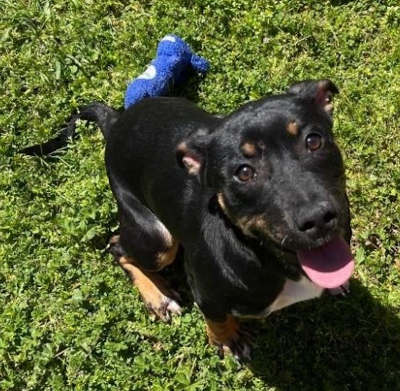 “Sparkles” is a 6-year-old female terrier with a short black and tan coat.