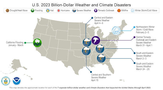 Seven separate billion-dollar disasters struck this year: Through the end of April 2023, the U.S. was struck with seven separate weather and climate disasters, each with losses exceeding $1 billion, including:
