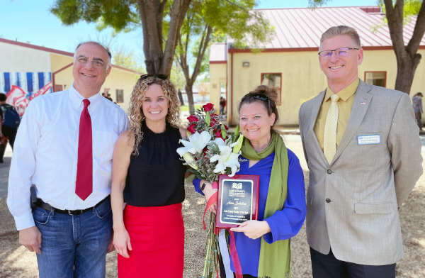 Her students and colleagues gathered at the Upper Lake High School, where she was presented with the Teacher of the Year plaque and flowers.