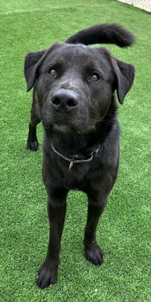 The dogs that are available for adoption include “Bubba,” a male mixed breed with a short black coat.