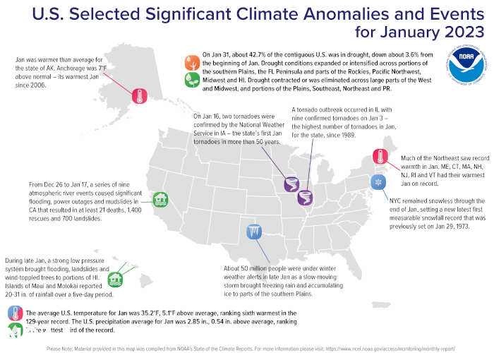 Below are highlights from NOAA’s U.S. climate report for January 2023:
