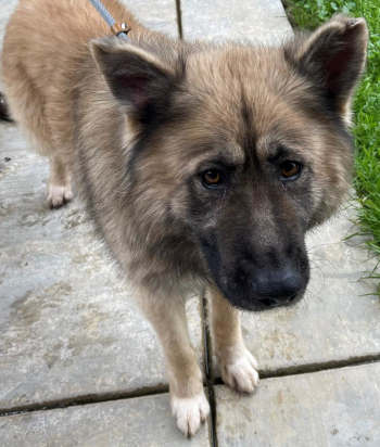 This 2-year-old male Akita-shepherd mix has a long brown coat.