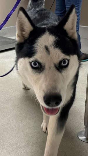 This 1-year-old female husky has a black and white coat.