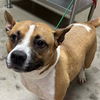 This 2-year-old female pit bull terrier mix has a short brown and white coat.