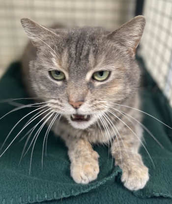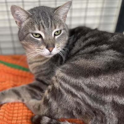“Wednesday” is a 3-year-old female domestic shorthair cat with a gray tabby coat.