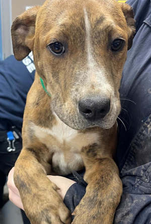 This 2-month-old male shepherd-pit bull mix has a short tricolor coat.
