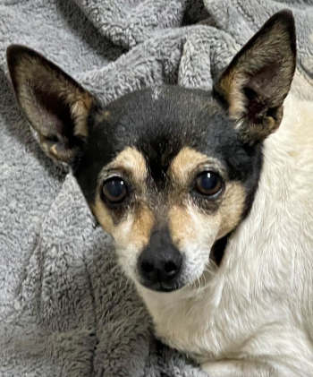 “Boopie” is a 12-year-old female Chihuahua-terrier mix with a short tricolor coat.