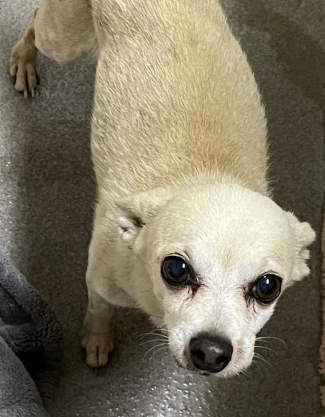 “Jay” is a 12-year-old male Chihuahua-terrier with a short white coat.