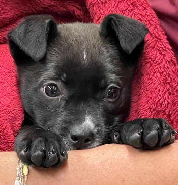 This 6-month-old male terrier has a short black coat.