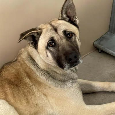 This 2-year-old male Akita-shepherd has a short fawn-colored coat.
