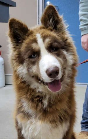 This 2-year-old male Akita-shepherd mix has a long brown coat.