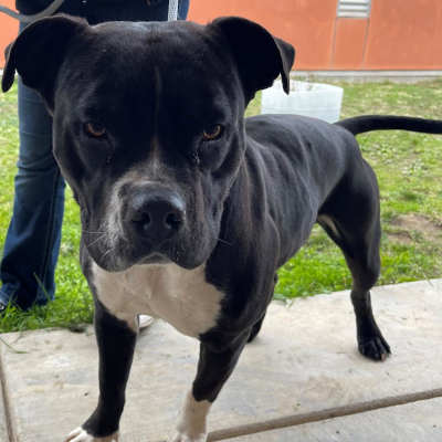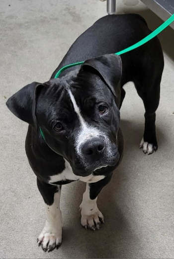 This 1-year-old male pit bull terrier has a short black coat.