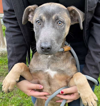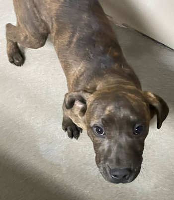 This 5-month-old male American blue heeler-hound has a short brindle coat.