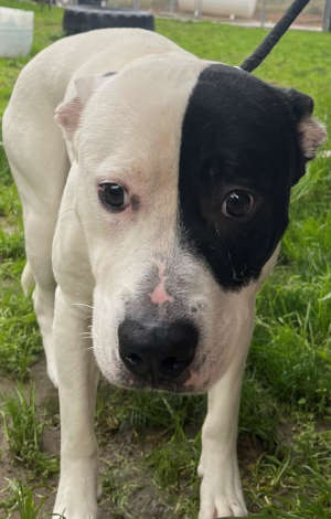 “Diesel” is a 2-year-old male pit bull terrier with a short white coat with black markings.