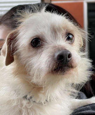 This 1-year-old male terrier has a tan and white coat.