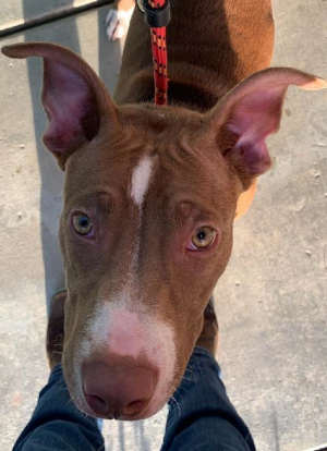 “Missy” is a 6-year-old female pit bull terrier with a short brown coat.
