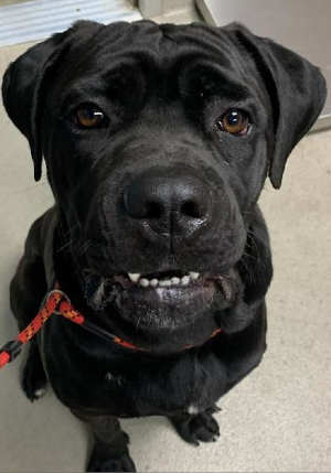 This 1-year-old male mastiff mix has a short black coat.