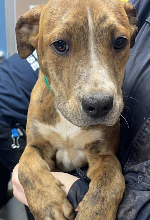 This 5-month-old female American blue heeler/hound mix has a short brindle and white coat.