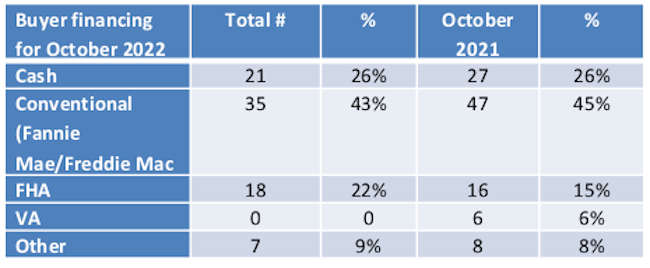 Of those, 43% were financed by Fannie Mae or Freddie Mac (“conventional loans”) compared to 45% for the same time last year; 22% were financed by FHA compared to 15% for this time last year); and 0% were financed by the VA or CalVet (compared to 6% for this time last year) 9% had other financing such as private loans or seller financed notes (compared to 8% last year at this time).