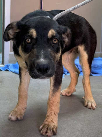 This male Rottweiler-shepherd mix puppy has a short black and tan coat.