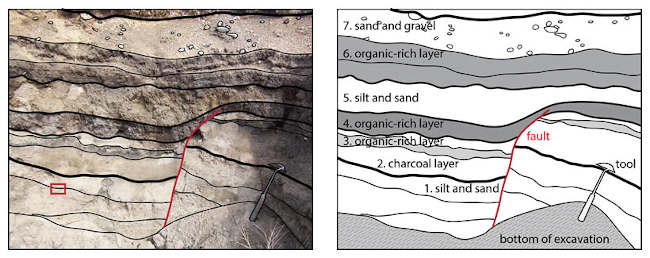 Whenever an earthquake happens, it leaves telltale signs that eventually get buried or imprinted into outcrops and other geologic formations. For instance, fault scarps (when a side of a fault has moved vertically with respect to the other), offset or folded layers of sediment and soil, and parts of the landscape that have been tilted, uplifted, or torn apart are all signs of an ancient earthquake.