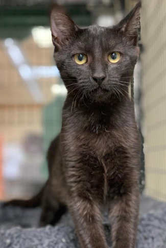This 2-year-old female domestic shorthair cat has an all-black coat.