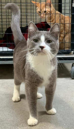 This 2-year-old male domestic medium hair cat has a gray coat with white markings.