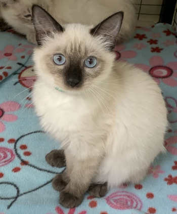 This 3-month-old female domestic medium hair kitten has a white coat with gray markings and blue eyes.